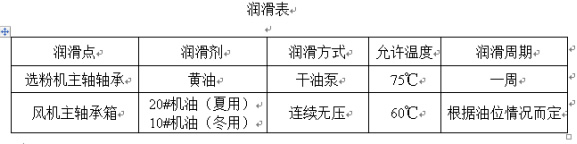 在日常運行中,應保證各潤滑點充分潤滑,并定期對粉分離器內軸承和風機軸承進行潤滑(見下表)。在日常維護中,注意粉體分離器轉子的平衡。如發(fā)現(xiàn)異常振動,應立即停機檢查原因,并可在運行前繼續(xù)故障。